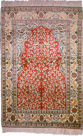 Kayseri carpets also known by the name "Bunyan" are made of pure silk, artificial silk and wool. In artificial silk and wool carpets, cotton yarn is used for warp and weft. In pure silk carpets, the warp and weft are also silk. Genuine Kayseri silk carpets have on the average 490-640 thousand knots per square meter. Artificial silk and wool carpets contain an average of 160-250 thousand knots per square meter.